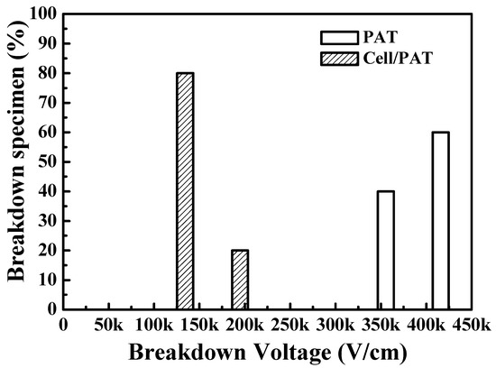 After culturing for 72 h, the PAT film with MG-63 cells exhibited a severe leakage current density at 150 kV/cm in comparison to the PAT film without MG-63 cells, as shown in Figure 3. In particular, the bone cell/PAT specimen showed a high percentage of breakdown specimen (~80%) at 150 kV/cm, revealing that the dielectric layer is passed by most of the currents before the capacitor breakdown. Similar results were also observed in the previous studies [11,14]. Cells on the PAT film surface were also observed by a cross-sectional microstructure image, as shown in Figure 4. Slit-like microvoids (as indicated by the black arrow) were found across the cell/PAT film. However, no slit-like microvoids could be observed in the PAT film without cells. This feature indicates that the failure is caused by mechanical reasons, and not from electrical reasons. The microvoids act as an electrical path that ultimately breaks down the capacitor with a low applied voltage. This is probably due to the PAT film undergoing some osteogenic reactions such as proliferation and differentiation. The formation of microvoids can be used to realize the stress variation of the PAT biosensing capacitor.