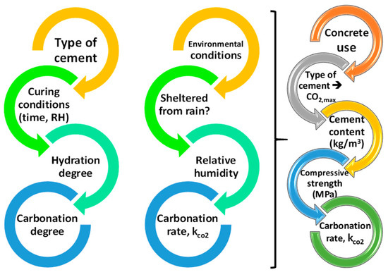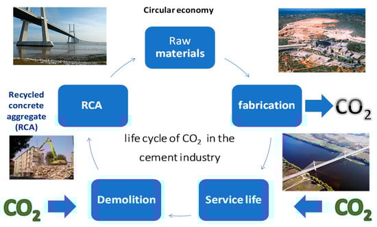 Cement is concrete’s main constituent because is responsible for the binding of all the components, which comprise, at least, clinker and gypsum. More sustainable cements also contain different amounts of industrial wastes such as coal fly ash, ground granulated blast-furnace slag, and/or silica fume. Clinker production requires the calcination of the limestone used as raw material. This reaction produces huge amounts of carbon dioxide, which is emitted into the atmosphere. Consequently, the reduction of these carbon dioxide emissions is paramount for a better future. On the other hand, mortars and concretes suffer a well-known chemical reaction named carbonation, i.e., calcium hydroxide, where C–S–H gel, ettringite, calcium aluminates, and others react with the carbon dioxide to form calcium carbonate [1]. Thanks to this chemical reaction, it can be said that part of the carbon dioxide emitted during the calcination process is reabsorbed by cement-based materials. Consequently, hydrated cement can be considered a carbon sink (Figure 1). However, the current methodology for reporting carbon dioxide emissions referred to in the Guidelines for National Greenhouse Gas Inventories [2,3], published by the Intergovernmental Panel on Climate Change (IPCC), does not considers the carbonation process. Therefore, carbonation is not included in national inventories. The net carbon dioxide emissions (carbon dioxide released by calcination minus carbon dioxide uptake by carbonation) should be calculated by the National Inventories of Greenhouse Gas Emissions in order to have accurate data for country reporting.