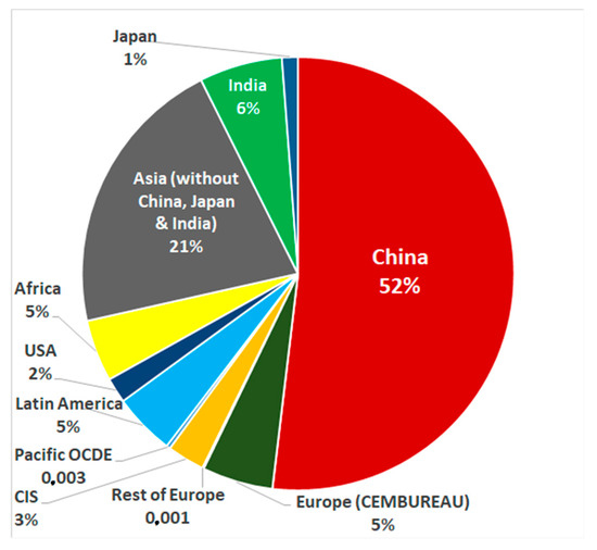 Carbon dioxide emissions per ton of cement have been lowered worldwide in the last few years [9]. Nevertheless, the production of cement is growing rapidly, achieving an amount of 4.65 billion tons in 2016 (Figure 2) [10]. Asia produces 80.5% of the world’s production, while Europe–CEMBUREAU only produces 5.3%.