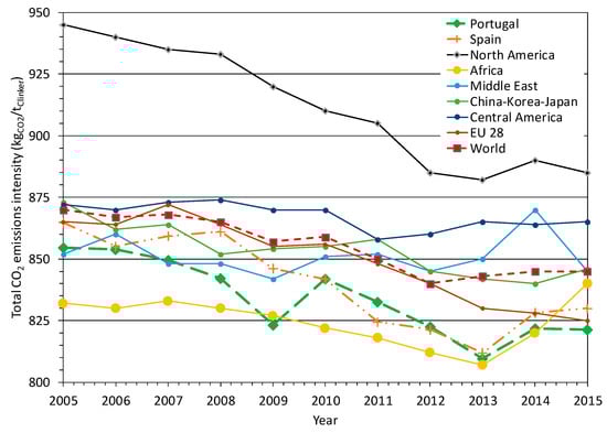 Figure 3 shows the gross carbon dioxide emissions for grey clinker; the emissions shown are the direct carbon dioxide emissions, except for the on-site electricity production and the emissions from biomass fuel. Carbon dioxide emissions due to clinker production have been reduced in the last decade, as shown in Figure 3 [9], from more than 925 kg CO2/t clinker (North America) in 2005 to 825–850 kg CO2/t clinker in 2015. In particular, it should be highlighted that Portugal has experienced a significant decrease from 855 kg CO2/t clinker in 2005 to 821 kg CO2/t clinker in 2015 (Figure 3).
