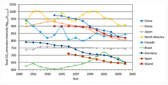 Additionally, it should be pointed out that the European cement industry, in general, has considerably diminished its environmental impact [9,10]. There was also a slight decrease in CO2 emissions in several countries in the 1990–2003 period, when considering both calcination process and fuel combustion per ton of cement, as shown in Figure 4 [11]. China, Spain, and Germany, among others, have exhibited a significant reduction of carbon dioxide emissions as consequence of their reduction of the clinker factor. That is, they followed a significant growing trend of blended cement production with an upward content of additions.