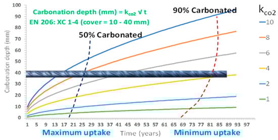 Carbonation is a physico-chemical process that has been extensively defined and modelled (Figure 6) in the literature [1,4,6,7,8]. Figure 7 summarizes the main factors that affect the carbonation uptake by mortars and concretes. These materials consist of a solid cement matrix that contains aggregates, capillary pores, and air bubbles in its interior. When one wants to calculate the amount of carbon dioxide fixed by the cement matrix, one needs to multiply the carbonation coefficient by the square root of the time ratio. Therefore, the decreasing trend of the square-root of time is well-known. This fact means that, after a period of time, the increase of carbon dioxide uptake is negligible. Given that, the carbonation uptake process involves two distinct parts: (i) maximum carbon dioxide uptake during the first twenty to fifty years and (ii) a negligible period (Figure 6). According to Figure 6, it takes between 20 and 25 years to reach 50% of carbonation and between 70 and 80 years to reach 90% of carbonation.