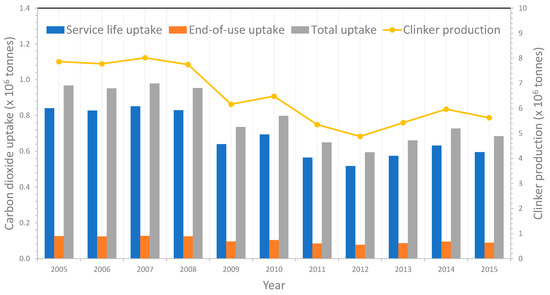 Table 2 shows the summary of the Portuguese domestic data for clinker annual production, total absolute gross CO2 emissions (without biomass emissions), and absolute gross process CO2 emissions from cement manufacturing plants between 2005 and 2015. The theoretical uptake has been defined as 23% of all CO2 emissions due to calcination for the service life period (20%) and the end-of-life plus secondary usage stage (2% + 1% = 3%), respectively [3]. Therefore, if a factor of 0.23 is applied to the absolute gross process CO2 emissions shown in Table 2, this factor was proposed in the IVL simplified methodology [3], the results that appear in Figure 8 can be obtained.