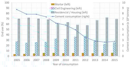 Cement consumption (solid line and left-hand scale) and end use of cement in concretes (bars and right-hand scale) from 2005 to 2015.