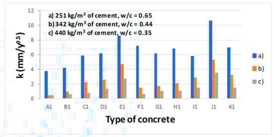 Carbonation rate of Portuguese concretes made with different proportions of coal fly ash and ground granulated blast-furnace slag and (a) 251 kg/m3 of cement, w/c = 0.65; (b) 342 kg/m3 of cement, w/c = 0.44; and (c) 440 kg/m3 of cement, w/c = 0.35 [17].
