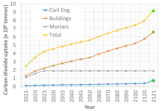 Carbon dioxide uptake (tons) considering the surface/volume (S/V) ratios of three for civil engineering works, eight for buildings, and 20 for mortars (mortars only carbonated for ten years). In addition, 3% of the absolute gross process CO2 emissions due to the end-of-life stage was added to the carbon dioxide uptake reached in 2021 (green point).