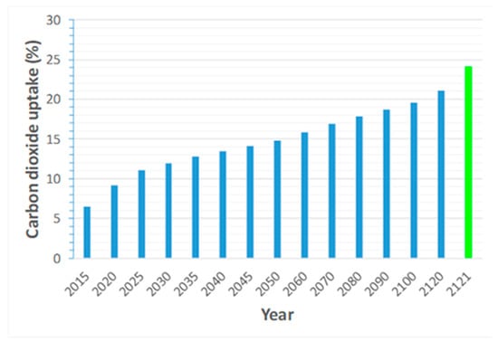 In the present case, it can be observed that the carbon dioxide uptake during the ten years production period (2005–2015) was found to go from 5.6 to 7.4 million tons from 2050 to 2100. Consequently, the percentage of carbon dioxide uptake, considering the absolute gross process CO2 emissions, was in the range between 14.7% and 19.6% (Figure 12). Consequently, the simplified method agrees with the carbon dioxide uptake from the origin considered in the present study until the year 2100. Nevertheless, 9.1 million tons of carbon dioxide will be uptake in the year 2121 (24.2%), when 3% of the absolute gross process CO2 emissions due to the end-of-life stage is added to the carbon dioxide uptake reached in 2021.