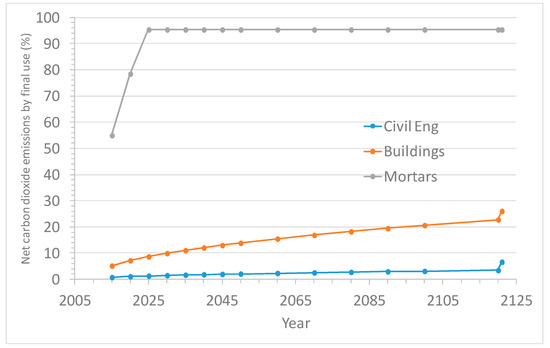 Figure 13 shows the net carbon dioxide emissions by final use of the mortars, building and civil works cement consumed in Portugal from 2005 to 2015. As expected, mortars carbonated very quickly, whereas civil works concretes carbonated very slowly. Consequently, the carbon dioxide uptake performed by mortars reached about 95% in ten years. On the contrary, after one hundred years of carbonation, civil works and building concretes only reached 6.6% and 26.0%, respectively.