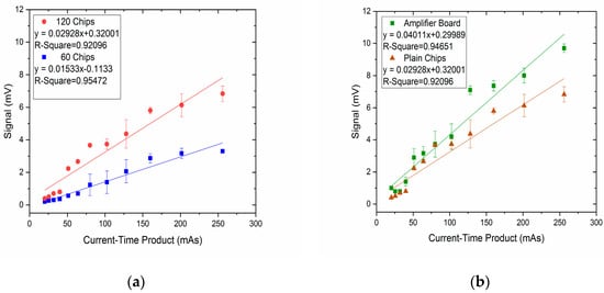 Tube current-time product (mAs) is a tube setting that regulates the X-ray beam’s population (number of photons in the X-ray beam) []. During mAs variation, Figure 5a shows a 3.49% decrease in the signal linearity coefficient (R-square) when the chip number was increased from 60 to 120. In this case, the R-square signifies the extent to which the signal data points conform to the linear fitting during mAs variation. When the chip number was doubled to 120 chips, it could be considered that there was no change in the linearity coefficient (the change was trivial). This is because only a 3.49% change was observed, and this change is below the 5% uncertainty (95% confidence interval) [].