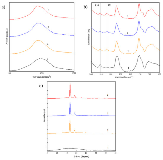 Fourier transform infrared spectroscopy (FTIR) spectra in (a) the C=O stretching region; and in (b) the region of 1000–650 cm−1 of PLLA nanofibers. X-Ray Diffraction (XRD) patterns presented in (c). The numbers 1–4 refer to the as-spun sample, and annealed samples at 90, 100 and 120 °C, respectively.