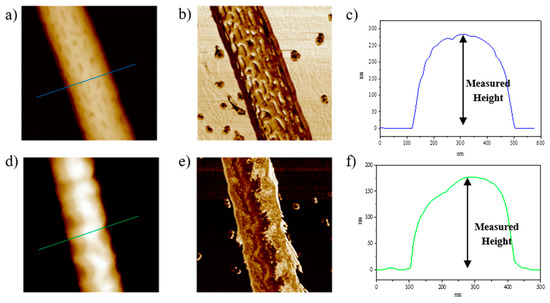 A comparison between tapping mode AFM images of the surface topography of as-spun and annealed nanofibers is given in Figure 3. The effect of the annealing process on the topographical features of the electrospun fibers clearly appears. The as-prepared sample shows a porous structure which most probably results from the solvent’s fast evaporation during the electrospinning process [42] (Figure 3a,b). Moreover, under the stretching effect occurring during the electrospinning process, all the polymer chains are expected to orient in the direction of the fiber axis, creating elongated pores at the sample surface. Annealing above the glass transition induces a rearrangement of the surface resulting in a more textured morphology. Although the details of the texture are obscured in the height image, they clearly appear in the phase image (Figure 3b,e) as granules probably corresponding to densely packed crystallites [43]. The diameter of a single nanofiber can also be measured from the tapping height image, although this should be done with caution. The estimation made by measuring the width of the nanofibers is usually inaccurate due to the tip convolution. The average diameter of the nanofibers should instead be evaluated by measuring the distance from the substrate to the highest point of the cross-section profile. It should also be noted that, when operating in tapping mode, the AFM tip gently touches the sample surface and the force between tip and sample is kept at a minimum. Therefore, any damage to the surface can be avoided and the height values measured are the “true” heights. As observed in Figure 3c,f, the width of the nanofiber would imply a diameter of approximately 380 nm for the as-prepared sample and 320 nm for the annealed sample, whereas the height cross-section profile, which is more reliable, indicates 285 nm and 175 nm for pristine and heat-treated nanofibers, respectively.