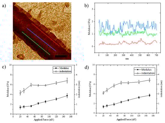 It should be noted that two precautions should be taken for an accurate study of the mechanical properties of the nanofibers. First, the modulus value should be measured along the spine of a nanofiber to minimize the effect of the tip convolution. Figure 4a,b illustrate the difference in modulus between three cross-section lines, one was taken at the top of the nanofiber and the other two were taken closer to the edge. It is clear that the modulus values taken at the top are always higher than those taken on the sides of the nanofiber. Due to the curvature of the fiber, the tip cannot not fully touch its sides which results in different contact areas as well as applied stress. This curvature effect is less pronounced at the highest points (the spine) of the nanofibers.