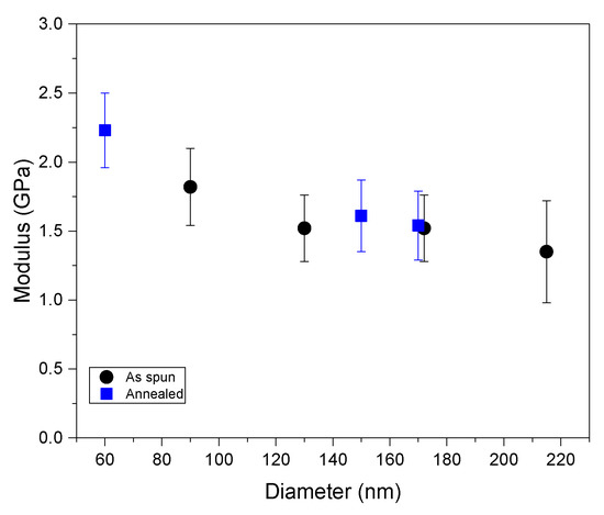 Elastic modulus as a function of the fiber diameters for as-spun and annealed nanofibers.