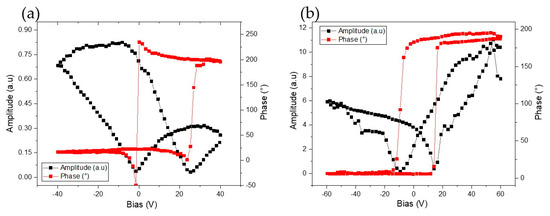 From the plotted loops, although no quantitative value for deformation amplitude detected by the PFM tip is available, clear enhancement in local piezo activity is observed when probing annealed nanofiber (Figure 7b). This result is significant considering lower driving voltage applied to this thermal-treated nanofiber (5 V) compared to the higher AC voltage (7 V) applied to the as-spun nanofibers. This improved electromechanical behavior can be explained by the fact that the crystallinity in the heat-treated sample was much higher. The occurrence of a longitudinal piezoelectric coefficient (d33) in crystalline PLLA electrospun nanofibers agrees with the fact that the α’-phase of PLLA have a space group P1211 [57], and therefore, belong to crystal class (C2). For materials of this class, the d33 exists [57]. Therefore, the qualitative PFM results revealed the promising potential of both amorphous and thermally treated PLLA nanofibers in terms of energy harvesting applications.