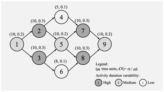 Let us refer to the nine-activity schedule network represented in Figure 1. This project consists of activities with varied duration variabilities (represented by different gray tones).