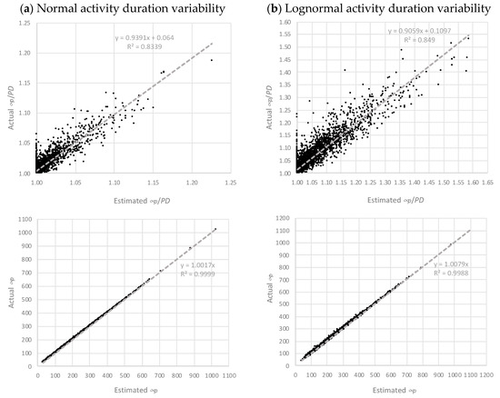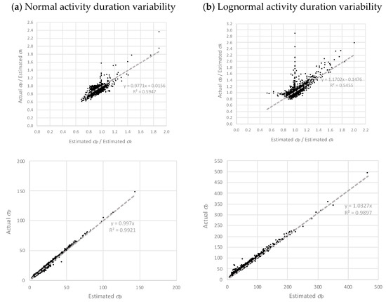Dataset I μp regressions with normal (a) and lognormal (b) activity duration variability.