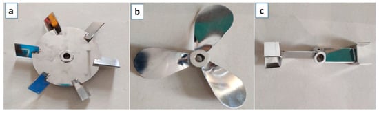 The diagram of the water model (a—disc turbine impeller; b—propelling propeller; and c—Intermig impeller).