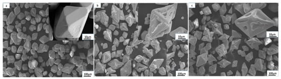 SEM images of the NH4ReO4 particles with different stirring paddle types (a—disc turbine impeller; b—propelling propeller; and c—Intermig impeller).