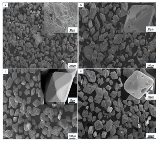 SEM images of the NH4ReO4 recrystallization particles at different agitation intensities (a—100 rpm; b—150 rpm; c—200 rpm; and d—250 rpm).