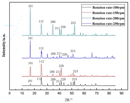 In order to research the relationship between the difference of crystal morphologies and the selectivity of crystal growth directions, XRD analyses were performed. The XRD patterns of the samples at different stirring speeds and the same crystallization time (2 h) are shown in Figure 5, and the XRD information is given in Table 2.