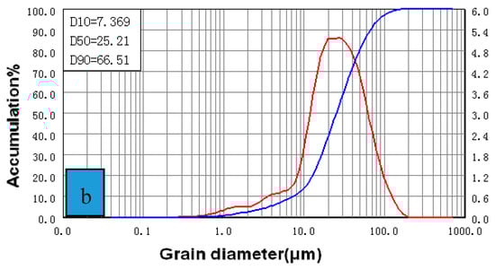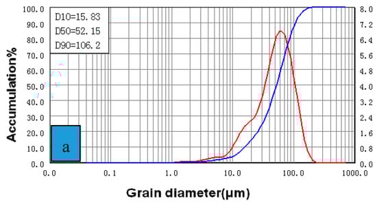 Particle size distribution of the rhenium samples. a—Sample was prepared with the NH4ReO4 crystals without recrystallization. b—Sample was prepared by the recrystallization NH4ReO4 crystals at 200 rpm. The red line represents particle size (µm), and the blue line represents the accumulation.