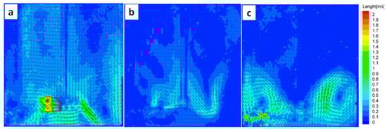 The velocity vector cloud diagrams of flow field distribution with different agitator types (a—disc turbine impeller; b—Intermig impeller; and c—propelling propeller).