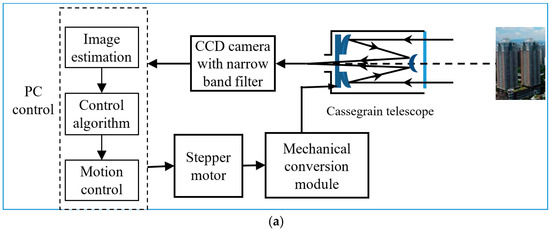 Applying the auto-focus principle above, the AFT of a Cassegrain telescope EOTS system was investigated, as shown in Figure 1. The EOTS system mainly consists of five parts [21]: Cassegrain telescope, CCD camera, PC control module, stepper motor, and mechanical conversion module. In the experiment, a Cassegrain telescope composed of a fold back mirror structure with two primary and secondary parabolic reflectors was used to collect the information of detected objects. To enhance the imaging quality, a Schmidt corrector was mounted in front of the telescope; there was also a CCD [22] camera with a narrow band filter to detect the image and to send the filtered results to the PC control module. In the control module, based on the image estimation, a stepper motor was used to adjust the position of the primary mirror of the telescope in the control device.