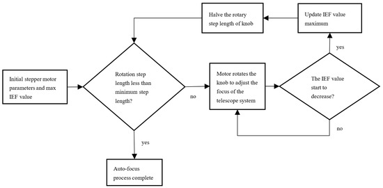 The focus search algorithm determines the concrete focus process of the system. In the experiment, the hill-climbing search method was used to achieve a better focusing effect. The specific steps are shown in Figure 2. First, we initialize the starting position of the motor knob and set a large initial rotation step length, recording the initial IEF value as the maximum value. The stepper motor rotates the knob at the current step length to adjust the focal length of the system and constantly calculates the IEF value. When the IEF value starts to decrease, it means that the best focusing position has been missed, and the knob is then rotated one step backward. Then, the current step length size is halved and the above search process is repeated until the search is completed with the minimum step size (accuracy) of the stepper motor. Then, the auto-focus process can be considered as finished.