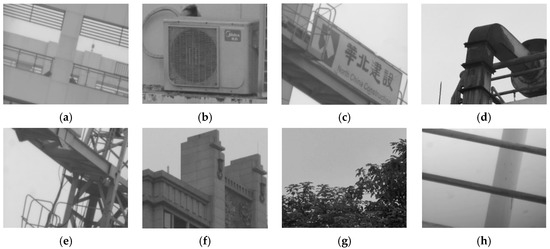 Different experimental scenes of the electro-optical tracking system (EOTS) auto-focus: (a) Windows of distant buildings, (b) Air conditioner outdoor unit, (c) Billboard, (d) Pipes on the roof, (e) Tower crane at a construction site, (f) Roof decoration of tall buildings, (g) Leaves in the distance, (h) Top railing of a building.
