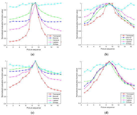 In our auto-focus process, the sharpness of the image captured by the CCD camera should be estimated firstly. Currently, the most commonly used image intelligibility estimation functions (IEF) are mainly performed in the spatial and frequency domains. Spatial domain IEFs include the Tenengrad function [25], Brenner function [26], variance function, and Laplace function [27], while the frequency domain IEFs mainly include the wavelet function and statistical gray level entropy functions [28]. Compared to blurred images, clear images have more detailed information in the spatial domain, and the gray scale gradients of adjacent pixels are relatively large. A suitable image function supports us in determining whether the image is focused or not, which is a pivotal step in the auto-focus process [29]. In order to provide an accurate comparison of the focusing sensitivity, the estimation function was normalized by the ratio of the peak deviation to the maximum value of the function and defined as