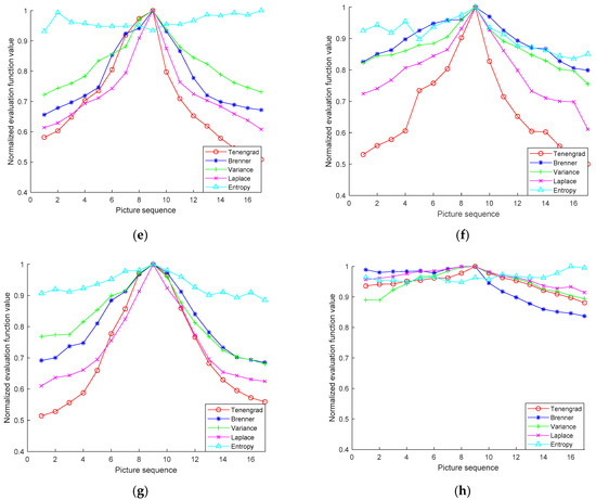 In Figure 4a–h, the entropy function has multiple peaks, indicating the presence of instability. In Figure 4h, the Brenner function and the Laplace function also have multiple extrema which are not applicable. In terms of the unimodal property found in the corresponding eight scenarios, the Tenengrad and the variance IEFs are relatively stable. In addition, the normalized Tenengrad IEF value drops faster on both sides of the peak, indicating that the Tenengrad IEF has higher sensitivity than the variance one. In order to quantify the focusing effect of different IEFs, the efficiency factors was defined as