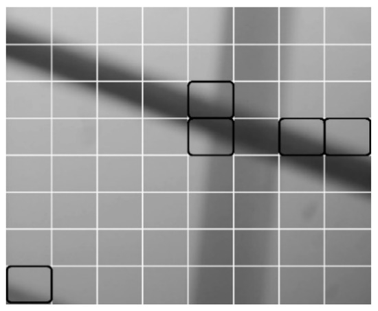 The threshold is set to u, then the sub-blocks with normalized IEF value larger than u (i.e., ) are ROI sub-blocks, while the remaining ones are considered as background blocks. For example, in Figure 5, a blurred picture with severe defocus of the scene in Figure 3h is divided into 8 × 8 blocks. Then, we used the Tenengrad IEF to calculate the normalized value of all sub-blocks in the auto-focus process, as shown in Figure 3h, and we chose five ROI sub-blocks with the largest change in the Δ value, as shown in black boxes in Figure 5.
