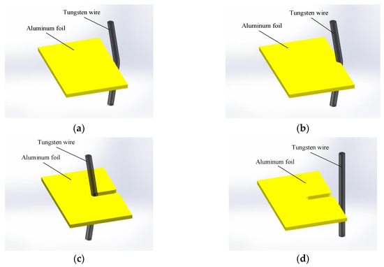 Process of cutting aluminum foil with a tungsten microwire: (a) the first step; (b) the second step; (c) the third step; (d) the fourth step.