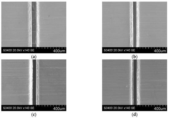 SEM micrographs of slits machined using different initial and secondary velocities: (a) 10 and 50 μm·s−1; (b) 10 and 500 μm·s−1; (c) 50 and 50 μm·s−1; (d) 50 and 500 μm·s−1.