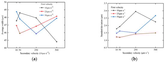 For a single slit, the width machined under initial velocity shows no difference from the width machined under secondary velocity. The maximum width standard deviation is 2.95 μm with an average width of 47.94 μm, which proves this method has great stability. In addition, it is worth mentioning that slits machined with an initial velocity of 25 μm·s−1 show the best consistency compared with others as shown in Figure 8.