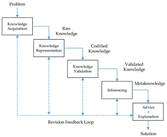To deal with disasters, we require an effective disaster management system. However, disaster management systems depend on various data and information and knowledge of previous disasters. Therefore, coordination between the relevant agencies is necessary to integrate the data effectively. A DSS is unable to prevent all catastrophic damage; however, it can mitigate the potential risks by developing early warning strategies and preparing appropriate options. Particularly in the context of disaster management [11], the process of developing intelligent systems focuses on the methods of transferring expertise from human experts to computers and implementing theoretical models based on the transferred knowledge. The model proposed by Turban (Figure 2) included the five main activities of DSS components [12]. Within the scope of AI, there are several methods for solving interdependent problems. Examples of alternative methods include Bayesian networks, which approximate reasoning (fuzzy logic), and metadata (artificial neural networks, machine learning, genetic algorithms, and swarm intelligence), which involves the use of a hybrid approach combining the fuzzy IF–THEN rules and optimization techniques to collect and present inaccurate information [13].