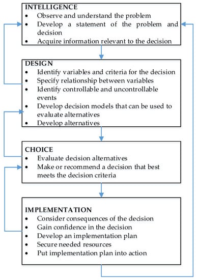 These systems use AI tools to infer, learn, memorize, plan, and analyze the data. Simon presented four stages in a decision-making process, which are displayed in Figure 3 [23]. Intelligence is the first stage of the study and requires the decision-makers to develop an understanding of the problem and collect information related to the decision-making. Similarly, the design stage involves characterizing the data with important variables based on decision issues, determining the criteria for the decisions, and developing decision models that can be used to evaluate alternative decisions. In the third stage, the decision-makers review the alternatives and choose the consolidated decisions that satisfy the alternatives. The final stage, sometimes referred to as evaluation, is when the decision-makers assess the consequences of a decision.