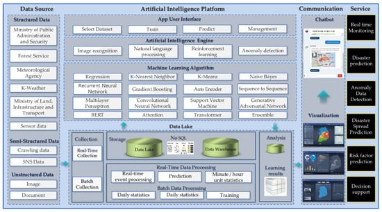 Big data result from the large amount of data generated by the explosive growth of information technology and communications, as well as by the rapid spread of smart devices [16,17]. They have been applied in several fields [18,19]. Using large datasets, it is possible to analyze past disaster data and develop future scenarios for the possibilities of disasters and the damage caused by them [20]. Big data contribute to the science of decision-making by developing a technology that can read common patterns of user behaviors and predict future steps [21]. AI is defined as a computer program that can think and process information like a human being. It is the science that enables computers to perform intellectual activities based on experience and knowledge. Existing data serve as the criteria for core judgments, and an AI learning algorithm narrows the choices for decision-making and provides feedback that is very similar to human judgment. For an optimal response to complex disasters, a large amount of data should be analyzed and used; hence, AI can be used to understand large-scale social phenomena [22]. By big data analysis and simulation, the selection of the required actual data can be achieved using the judgment of AI based on the existing empirical data.