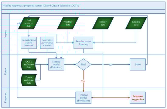 The algorithm modeled for the machine learning data analysis is displayed in Figure 5. It uses convolutional neural network (CNN) and generative adversarial network (GAN) algorithms for natural disaster detection and employs reinforcement learning (RL) to predict wildfire direction. A CNN is a specific type of artificial neural network that uses perceptron, a machine learning unit algorithm, to analyze the data. A CNN can be applied to image processing, natural language processing, and other types of cognitive tasks.