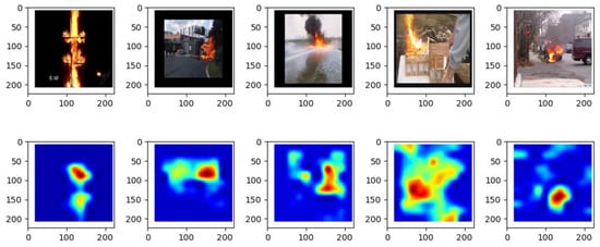 The experiment was performed using an NVIDIA GeForce GTX 2080 Ti with 12 GB onboard memory and a deep learning framework [34] on an Intel Xeon CPU E3-1230 v6 with 32 GB RAM. From the results, it was noted that FireNet could predict the test data with an accuracy of 91.2%. Figure 6 displays the grad class activation map (CAM) results, elucidating how the computer differentiated between a fire and a non-fire. This demonstrates that this algorithm can be used for automatic fire detection and can suggest the appropriate response.