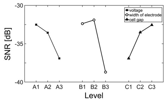 In the case of factor C, the response time of the liquid crystal is seriously delayed if the thickness of the LC layer is excessively larger than the width of the diffusing unit, and the applied voltage becomes higher. Therefore, factor C was restricted to level 3. After factors B and C were fixed to levels 2 and 3, respectively, factor A was set to 15, 14, and 13 V, which correspond to level 1 and below. Each performance characteristic and SNR were calculated to identify the optimal values of factor A. The SNRs for 15, 14, and 13 V were −28.32, −31.23, and −33.31 dB, respectively. The SNR was highest when factor A was 15 V. Accordingly, the optimal design conditions for the applied voltage, electrode width, and cell gap of the ELC diffusing unit were 15 V, 2 and 42 µm, respectively. Under these conditions, the SNR of the performance characteristic for the retardation distribution was calculated as −28.32 dB.