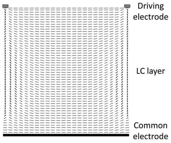 A maximum thickness for the maximum retardation of 15,500 nm was determined at the center of the ideal diffusing unit by applying a diffusing unit size of 37 µm and a refractive index of 1.5 to Equations (1)–(3). Accordingly, the cell gap needs to be at least 36.91 µm for the birefringence of liquid crystal of 0.42 from Equation (4) to obtain the retardation of 15,500 nm in the ELC diffusing unit. In addition, the optical axis of the LC molecules needs to align in the vertical direction from the glass surface at both ends so that the retardation can become 0 to enable a 15,500 nm difference in the retardation at the center and both ends of the unit. Therefore, it is necessary to infinitely increase the applied voltage, which generates a strong vertical electric field at the electrodes and across the entire ELC diffusing unit. Consequently, the optical axes of the LC molecules are excessively arranged in the vertical direction from the glass surface such that the retardation distribution of the diffusing unit deviates from the ideal retardation distribution.