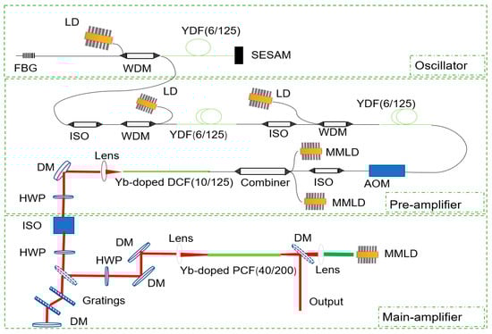 Schematic diagram of the laser system. FBG, fiber bragg grating; ISO, isolator; LD, laser diode; WDM, wavelength division multiplexer; YDF, Yb-doped fiber; DCF, double-clad fiber; PCF, photonic crystal fibers; MMLD, multi-mode laser diode; DM, dichroic mirror; HWP, half wave plate; AOM, acousto-optic modulator.