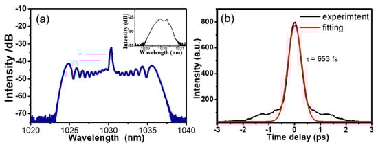 The oscillator emitted up to 4.5 mW average power at a repetition rate of 25 MHz and a central wavelength of 1030 nm, corresponding to 0.18 nJ for the pulse energy. The spectrum of the compressed pulses is depicted in Figure 2a. The spectrum covered a full width at half-maximum (FWHM) bandwidth of 12.5 nm, as compared with that of 1.3 nm for the laser oscillator. The autocorrelation trace in Figure 2b exhibited a FWHM of 653 fs, corresponding to a pulse duration of 371 fs by taking hyperbolic secant fitting.
