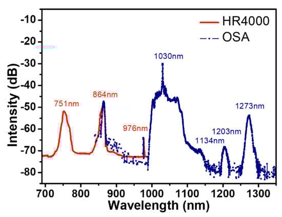 The spectrum measured by optical spectrum analyzer (blue curve) from 850 to 1350 nm and by HR4000 (red curve) from 700 to 1000 nm on a logarithmic scale. The spectral resolution for the HR4000 is 0.27 nm. Five parametric sidebands were generated, such as 751, 864, 1134, 1203, and 1273 nm, with the fundamental wave at 1030 nm. The peak at the wavelength of 976 nm indicates the residual pump laser.