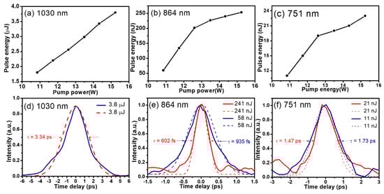 The evolution of the output pulse energy with increased pump power for the fundamental wave at 1030 nm (a), and anti-Stokes lines at 864 nm (b) and 751 nm (c). The measured autocorrelation trace for the fundamental wave at 1030 nm (d), and anti-Stokes lines at 864 nm (e) and 751 nm (f). The fundamental wave and anti-Stokes lines were selected by bandpass filters. In Figure 4d–f, the solid curves resulted from experimental measurements, while the dashed curves were via hyperbolic secant fitting.