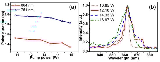 (a) The pulse duration of parametric waves as pump power increased. (b) Spectra for the parametric wave centered at 864 nm with different pump power levels. The spectra were taken by HR4000 with bandpass filters with 40 nm transmission band. The pulse duration in (a) was retrieved by hyperbolic secant fitting.