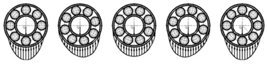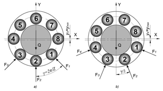 During the operation of the rolling bearings, in relation to the direction of the external load action, the set of rolling elements continuously oscillates between the two end positions of the support shown in Figure 1. This phenomenon is described in detail in [19,20,21,22], where the following terms were adopted for these boundary positions: