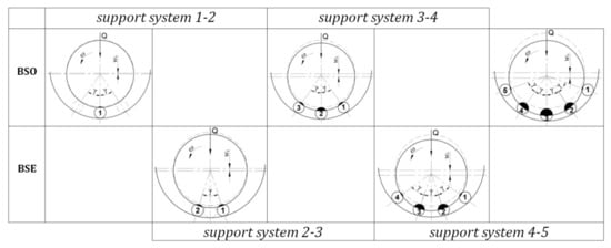 Due to the load and the occurrence of contact deformations, additional displacement and approach of the inner ring of the bearing relative to the external will occur and the new rolling elements will come into contact with the bearing rings. The support of bearing will continue to happen between the two boundaries positions: on the even (BSE) and the odd (BSO) number of the rolling elements. Only, depending on the size of contact deformations, the support system will move from the support system 1-2 to the support system 2-3, 3-4, 4-5, etc., as shown in Figure 3 [19,21].