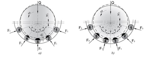In the case of an unloaded bearing or a bearing loaded with relatively low loads, the contact deformations are insufficient to annul the influence of the internal clearance and the inner ring will be supported on one or two rolling elements, as shown in Figure 1. For this case of support in literature [29], a term support system 1-2 was adopted.